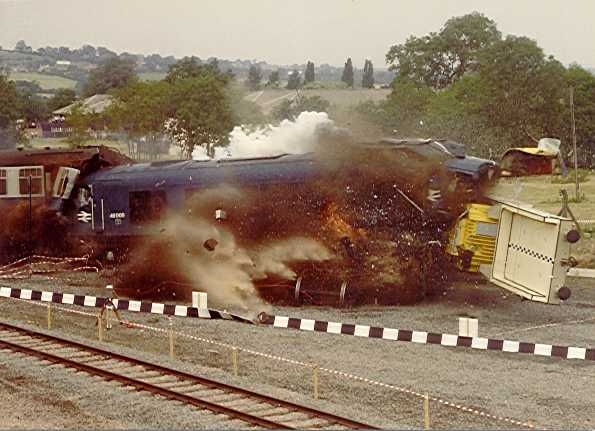 TV kameraerne var på plads, så sammenstødet kunne vises direkte i frokost nyhederne. Et filmkamera var placeret på førerens plads. En udsmidningsmekanisme var beregnet til at redde kameraet før påkørslen. Et andet filmkamera var i en helikopter som fulgte toget fra Edwalton til slutningen af rejsen. Billederne blev vist over det meste af verden. En uhyggelig stilhed bredte sig blandt tilskuerne, da toget kom frem fra Broughton Bank og susede forbi tribunerne. Klokken 13.18 ramte lokomotivet containeren med et enormt brag. En tyk sort røg og røde flammer omsluttede stedet i nogle minutter. Da røgen var drevet væk kunne man se, at containeren kun var blevet skubbet 60 meter. I stedet for at skubbe containeren, var lokomotivet kørt over den og fortsat yderligere 100 meter. Vognene lå tilfældigt - med kun enkelte knuste vinduer - på resterne af sporet. Alt i alt var stumperne væsentlig mindre spredt end forventet. En fin sky af kølevand slap ud af containeren ved påkørslen, men totalt var trykket reduceret med 0,02 promille. Sir Walter var henrykt, CEGB anså forsøget for vellykket og det vil ikke blive gentaget. Miljøfolk var ikke så sikre og påpegede at pengene kunne være brugt bedre. Containeren blev sendt tilbage til Sellafield, gjort i stand og bruges sandsynligvis stadig. 46009 og vognene blev efter nogen tid ophugget på stedet. I lang tid var der rygter om yderligere en kontrolleret påkørsel i Grimston tunnelen, men det var ikke rigtigt. Det er ikke hensigtsmæssigt at arrangere en påkørsel i en tunnel, da der kan opstå uigenkaldelige skader på tunnelens indvendige beklædning.